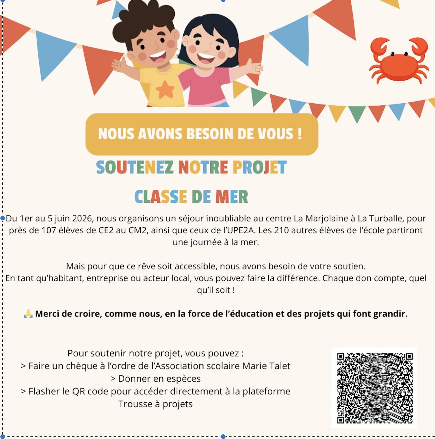 Nos élèves de la TPS au CE1 participeront à une journée à la mer, tandis que l'ensemble des élèves du CE2 au CM2 ainsi que ceux de l'UPE2A vivront une classe de mer du 1er au 5 juin 2026 au ...
