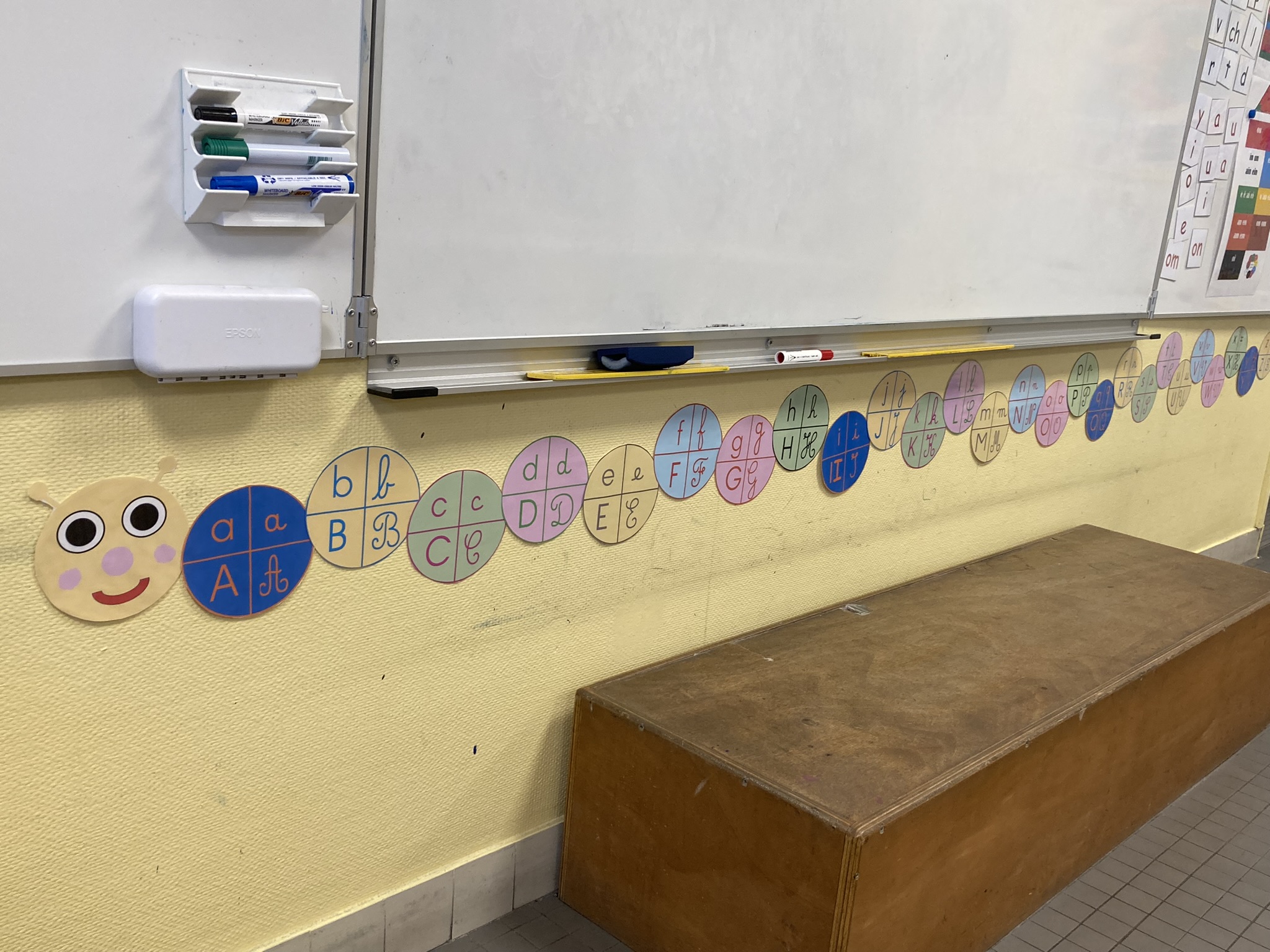 * l'affichage de la chenille pour la classe, autour de l'alphabet, dans les 4 écritures: